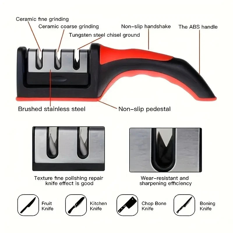 1.knife sharpener designed sharpening slots with 3stage sharpening system specially , Made of Ceramic Stone, Tungsten Carbide Plates, Diamond rods Knives Sharpener Safe and Non-Slip, ergonomic handle & anti-skid base design makes the sharpener very comfortable to use.